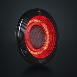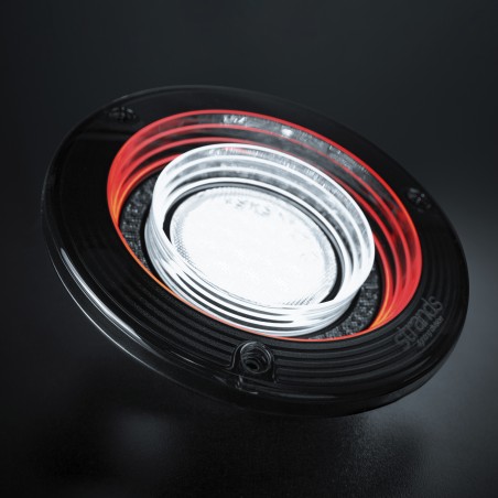 Feu arrière LED compact à double fonction (Recul et Antibrouillard) avec design circulaire "Dark" et optique nid d'abeille.