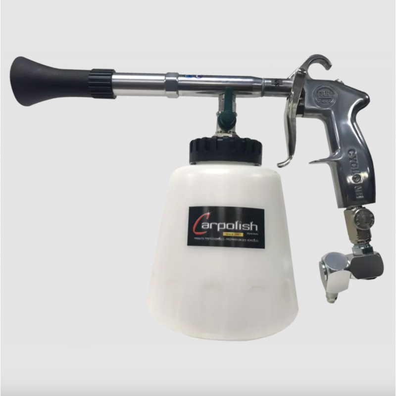 Surnommé la "baguette magique" des préparateurs esthétiques, l'Air Cleaning Foam Pistol Tornador Black est l'outil indispensable pour un nettoyage en profondeur de l'habitacle. Ce pistolet pneumatique utilise une technologie de rotation cyclonique pour pulvériser l'air et le produit nettoyant avec une force extrême. Il permet de désincruster la saleté dans les zones les plus inaccessibles (grilles d'aération, glissières de sièges, vides-poches) et d'extraire les taches des textiles sans effort manuel.